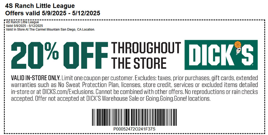 Hello, our partner Dick’s Sporting Goods will be hosting an All Star Weekend discount shop event for 4S Ranch Little League. You will